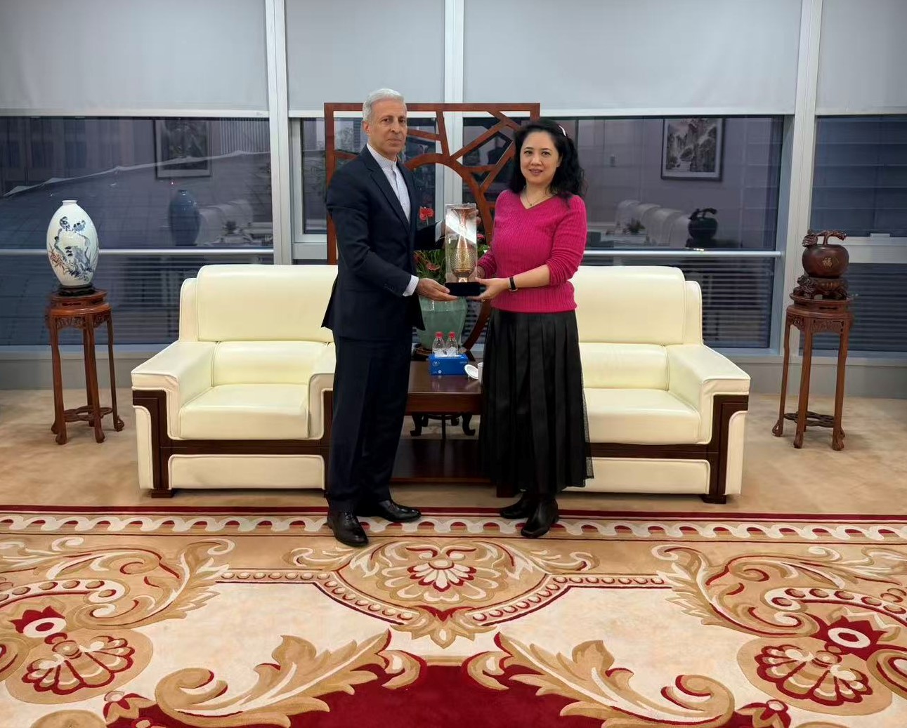 جناب آقای حریری، سرکنسول محترم کشورمان در گوانجو در روز پنج شنبه مورخ 13 آذر1404 به منظور بررسی و پیگیری چالشهای مالی و بانکی ایرانیان مقیم، تجار و دانشجویان، با خانم لی سوایچان، مدیر ارشد و معاون رئیس در زمینه افتتاح حسابهای شرکتیBank of China دیدار و گفتگو نمود.